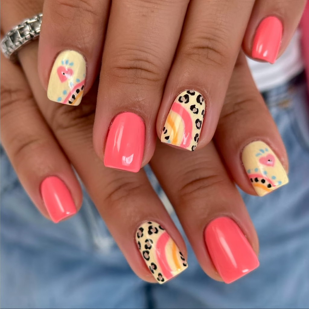 This set is not for the faint of heart—and that’s exactly why we love it. Mixing hot coral polish with tribal prints, hearts, rainbows, and even leopard spots, it screams bold summer energy. Done in a square cut for that modern edge, it pairs beautifully with denim jackets, crop tops, or colorful kimonos. It’s the kind of fun, Western-inspired look that turns heads at festivals or pool parties.