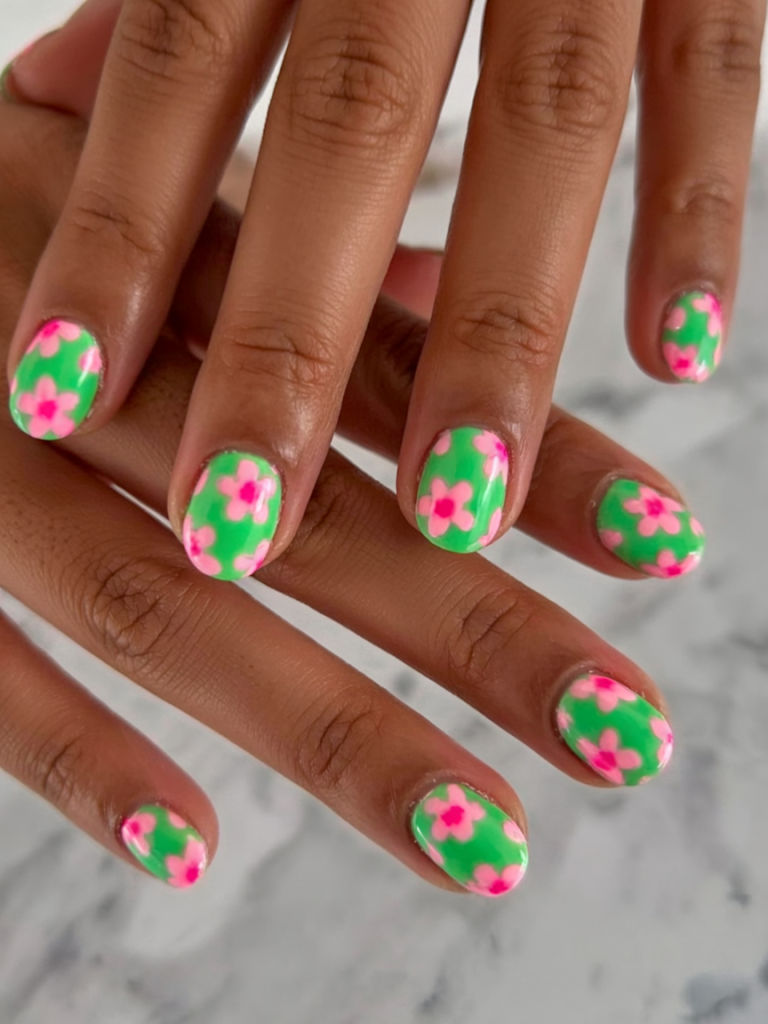Floral meets retro in this ultra-fun green and pink daisy mani. Perfectly symmetrical and painted on round nails, the look delivers a huge dopamine hit. If you’re ready to channel your inner ’70s babe this summer, this is the way to go. Think platform sandals, high-waisted flares, and big hoop earrings. It’s giving disco picnic—and we’re absolutely here for it.