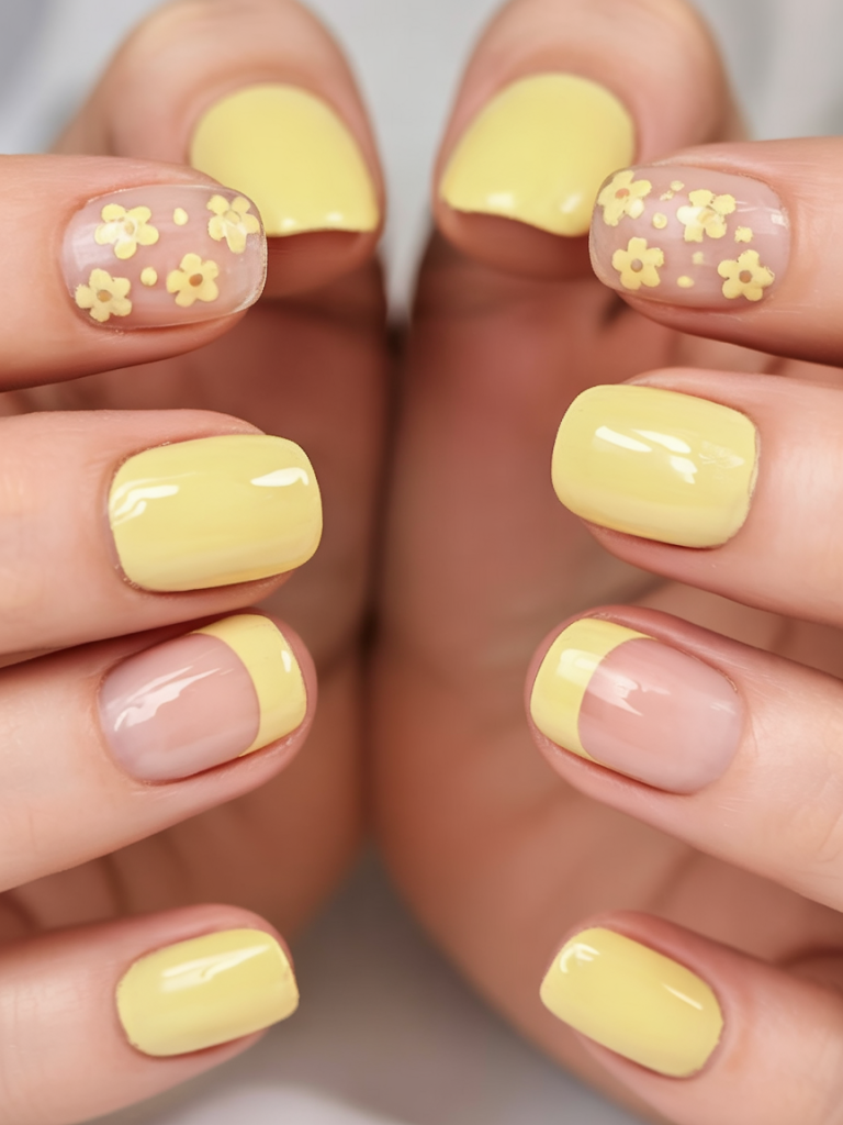 This design marries simple elegance with playful charm. The creamy yellow polish alternates with sheer bases and daisy appliqués, creating a natural floral look. The square shape gives it a clean, structured finish that’s ideal for office days and weekend brunch alike. It’s a pretty, easy style for anyone new to nail art, but still trendy enough to get compliments. Imagine it with a flowy white sundress and straw bag—hello, weekend goals!