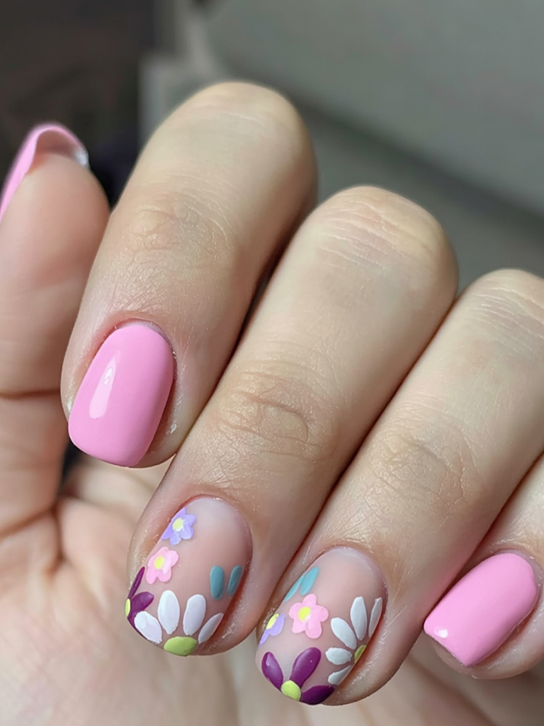 We’re loving this pink and floral fusion—it’s youthful, cute, and totally in line with 2025’s pastel obsession. The mix of opaque pink nails and clear bases with vibrant daisies feels fresh and carefree. Styled in a softly square cut, it’s one of those gel or dip options that works with both sandals and sneakers. Add a flirty floral romper or almond-toned top for a chic, coordinated finish.