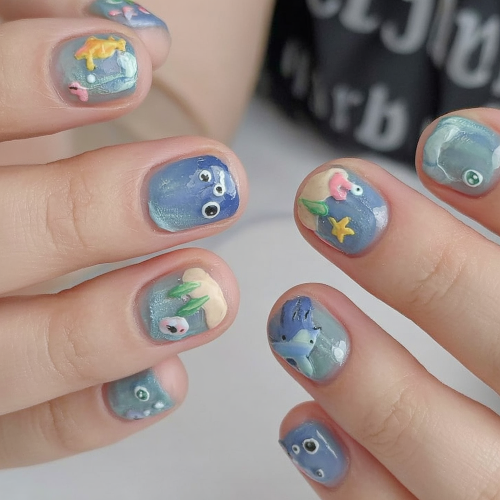 This 3D ocean-inspired mani is what summer dreams are made of. Each short nail features unique aquatic elements—from bubbly-eyed creatures to delicate seaweed and coral designs. It’s giving full-on vacation energy and would pair perfectly with a blue one-piece and sarong at a beach bar. The slight round shape keeps it soft and playful. Bonus: It’s also one of the most fun and unique styles to rock at a summer festival or themed party.