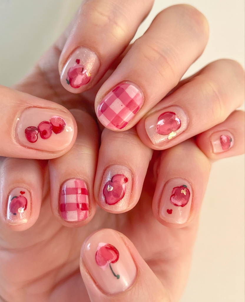 If you’re the kind of girl who lives for gingham, cold lemonade, and vintage vibes, this set is your soulmate. Tiny cherries and red plaid accents give major retro charm, while the sheer background keeps it modern. The short, softly square nails feel natural yet polished. This acrylic or gel option is ideal for Fourth of July get-togethers or strawberry-picking Saturdays. Add a red bandana, denim cutoffs, and a basket bag for the full effect.