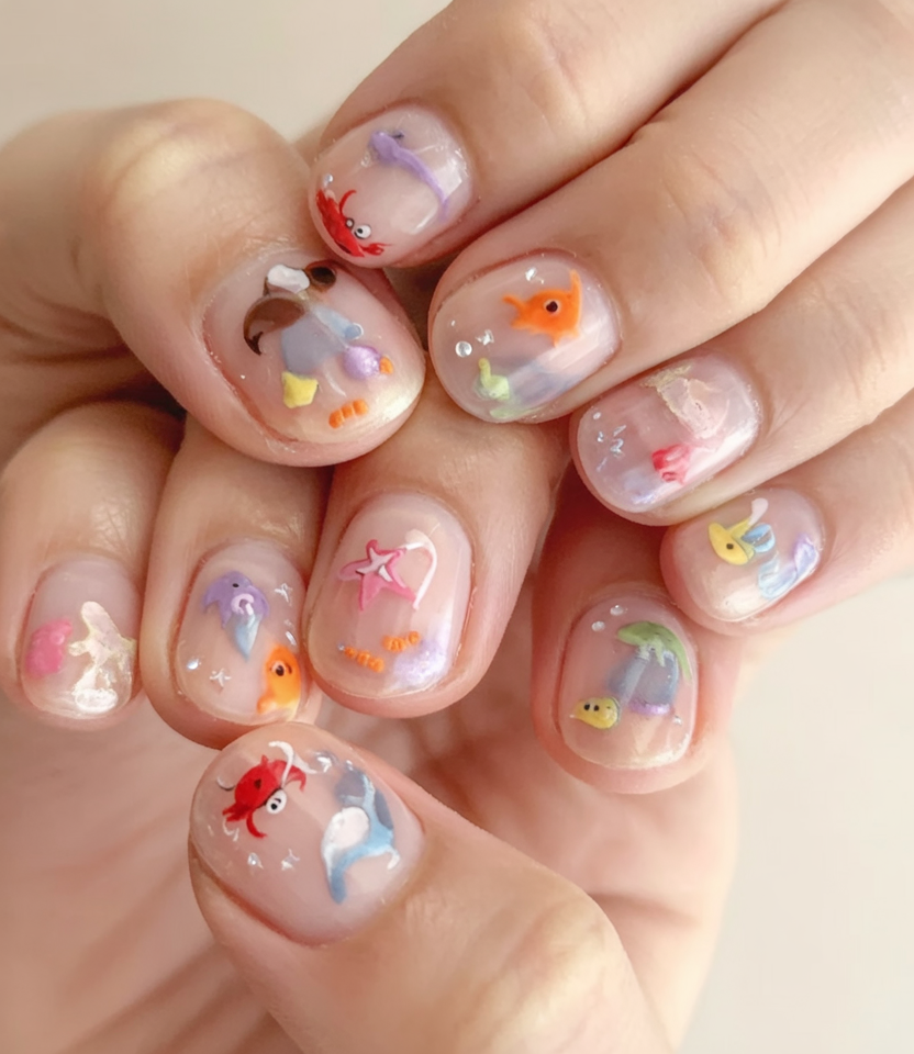Another oceanic stunner, this bright, sheer mani features mini sea creatures like starfish, dolphins, and playful crabs. It’s all about the details—and this round, transparent base makes every little drawing pop. If your summer includes snorkeling or just sipping coconut water by the pool, this is the fun, easy style to rock. Great with a tropical print sarong or even a white crochet beach cover-up.