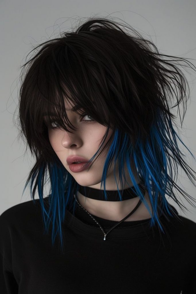 If you’re looking to experiment with color while keeping a dark base, this edgy shag cut with blue dip-dye is the way to go. The black foundation gives the style depth, while the electric blue at the ends adds a modern, rebellious twist. This look is perfect for someone who wants to make a bold statement without going too far from the dark hair color palette. The short, shaggy layers give the hair volume and movement, making it ideal for those with finer hair looking to add texture. The deep blue highlights are a playful yet sophisticated touch that will keep you turning heads all season.