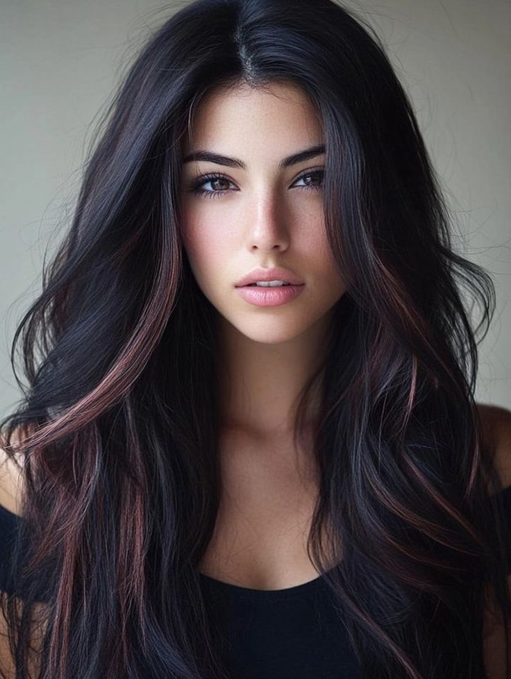 This classic wavy look is elevated by subtle brown highlights woven into the deep black hair. Ideal for brunettes, the soft touches of brown lighten the hair just enough to add dimension without straying too far from the dark color palette. This hairstyle is perfect for those looking for inspiration in 2024 while maintaining an understated elegance. The long waves add a soft romantic flair, making this look ideal for various occasions, whether it’s for a casual day out or a festive holiday party. It’s perfect for those who want to stick to brunette ideas but want to experiment with subtle balayage.