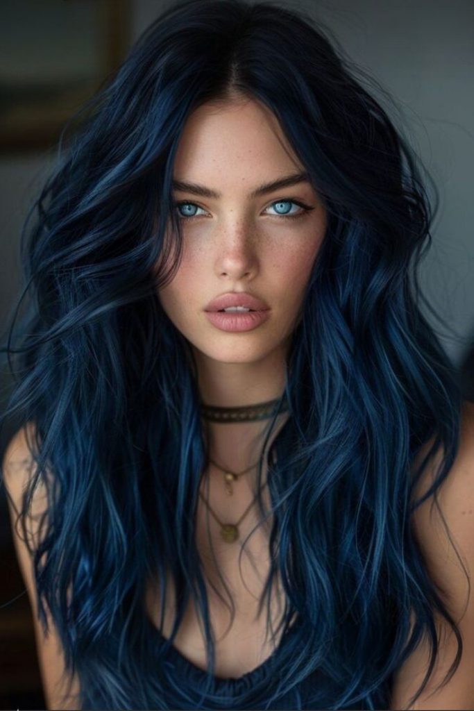 For those looking for a bold yet sophisticated winter hair color, midnight blue is the shade to go for in 2024-2025. This rich, deep hue is perfect for long hair as it accentuates the length and adds a mysterious vibe. The loose waves bring texture and life to the hair, making the blue tones stand out even more. This look is ideal for those wanting to try something outside the box while still staying within the dark hair color palette. It’s edgy yet elegant, and the perfect shade to experiment with this winter.