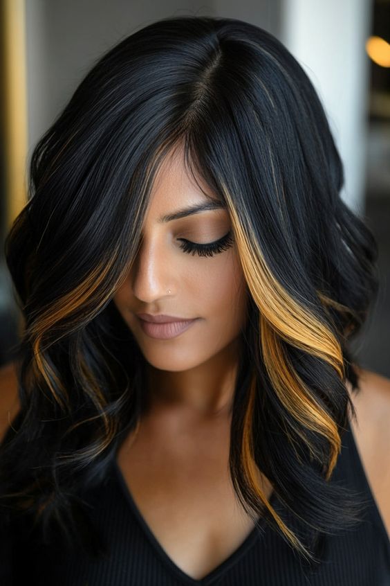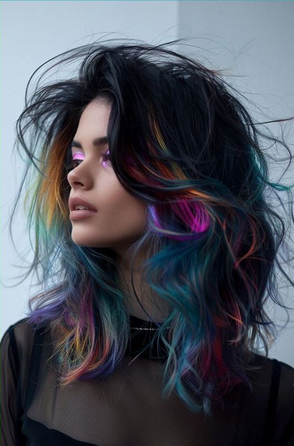 For the creative and adventurous, this look is a color palette masterpiece. The black hair is the perfect canvas for vibrant shades of blue, purple, and pink, giving off a cosmic, futuristic vibe. This style is ideal for anyone who wants to break free from traditional dark hair colors and embrace a burst of color. The waves allow the various shades to blend seamlessly, giving the hair dimension and depth. It’s a perfect look for 2025 if you’re someone who enjoys experimenting with bold, out-of-this-world color combinations. Plus, it’s sure to brighten up even the darkest winter day!