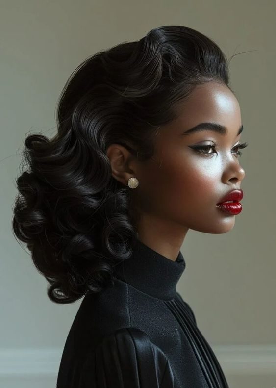 If you’re channeling old Hollywood glam, this elegant black hairstyle with defined vintage curls is your go-to look for 2024. The rich black shade emphasizes the sheen and smoothness of the curls, giving it a sleek and polished appearance. This hairstyle works wonderfully for special events and formal occasions, offering a sophisticated yet timeless style. Whether you have short or medium-length hair, this look is perfect for adding a bit of vintage drama to your winter wardrobe. The deep color enhances the luxurious feel of the curls, making this a must-try for those aiming for elegance.