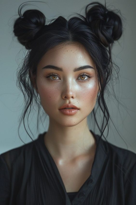 If you’re in the mood for a fun and youthful hairstyle, these asian-inspired space buns with a dark, glossy finish are a great way to show off your adventurous side. The rich black color enhances the shine and definition of the hair while keeping the overall look elegant. Whether you’re rocking a casual outfit or dressing up for an evening out, this hairstyle adds a playful touch while keeping it sophisticated. Perfect for curly or straight hair, this style can be easily adapted depending on the occasion.