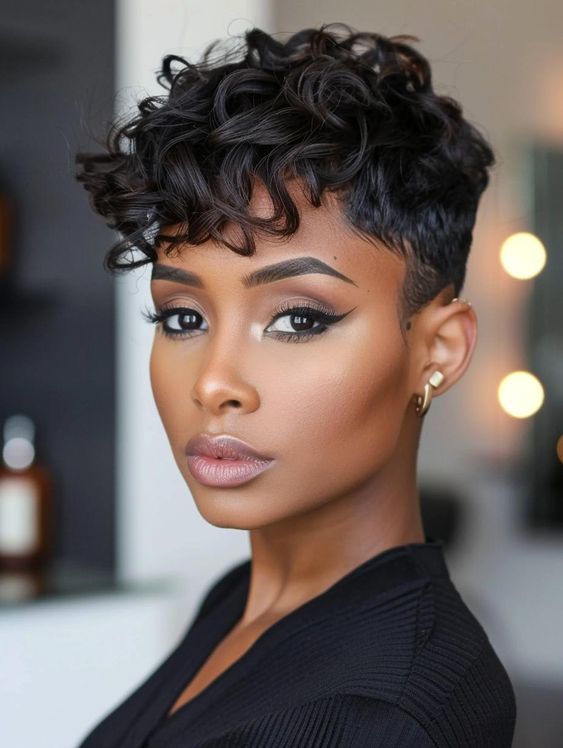 For those with natural curly hair, this soft pixie cut is a chic, low-maintenance option that works well during the winter. The rich black tone of the hair enhances the curl pattern, adding depth and movement to the cut. This style is particularly suited for short hairstyles, offering a structured yet relaxed look that flatters all face shapes. Whether you’re dressing up for an event or just running errands, this cut gives you the flexibility and style you need for winter 2024.