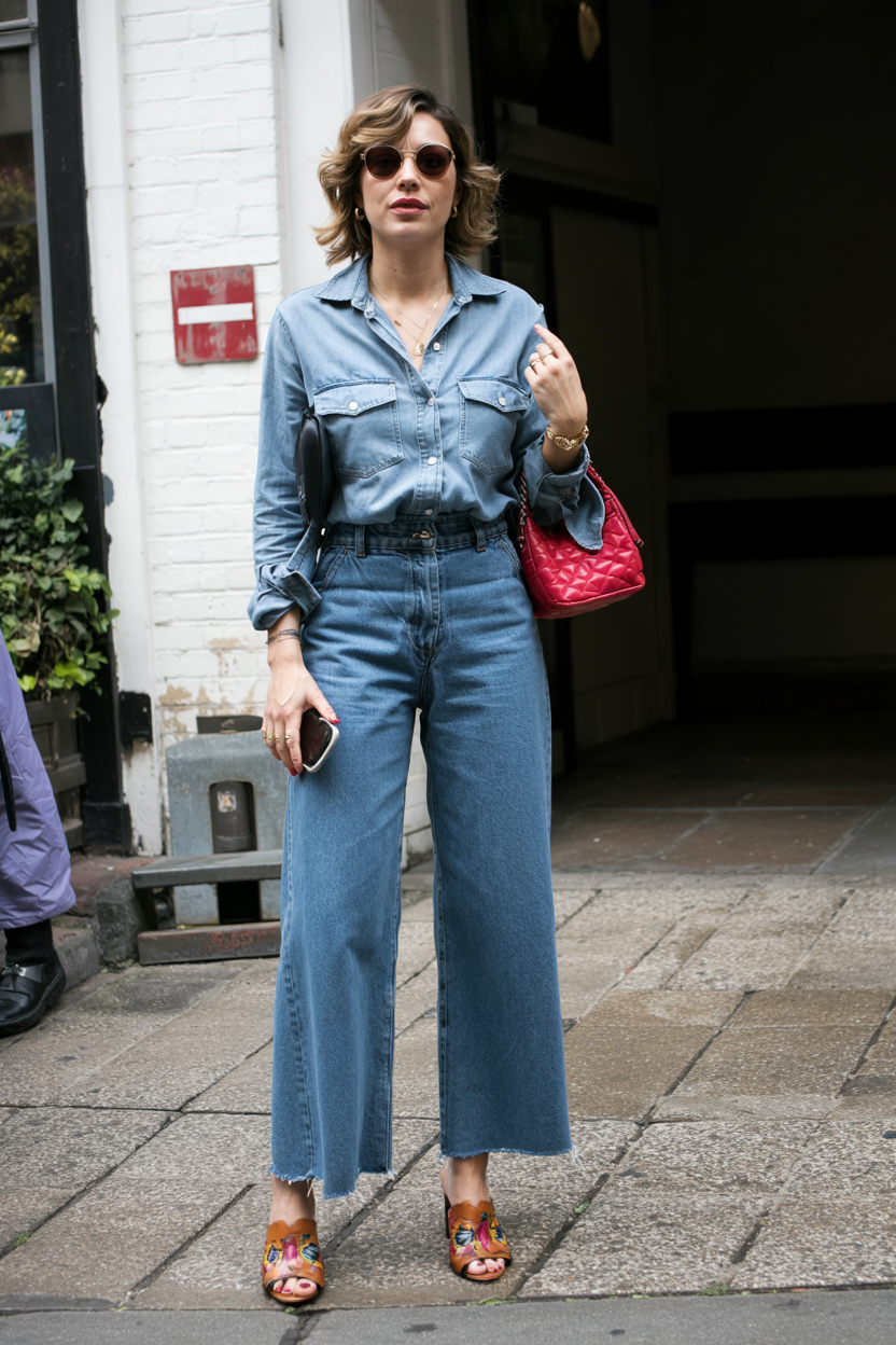 There’s an almost nostalgic quality to this outfit, as if it’s the ultimate love letter to denim, with a fun twist. The cropped denim shirt paired with the high, flared culotte-style jeans exudes that “I’m-a-stylish-gal-if-you’ll-notice” attitude. The pop of color from the colorful bag and sporty heels keeps the whole thing in check when it comes to keeping the style from feeling too serious, and the high waistline provides some definition without the squeezing.