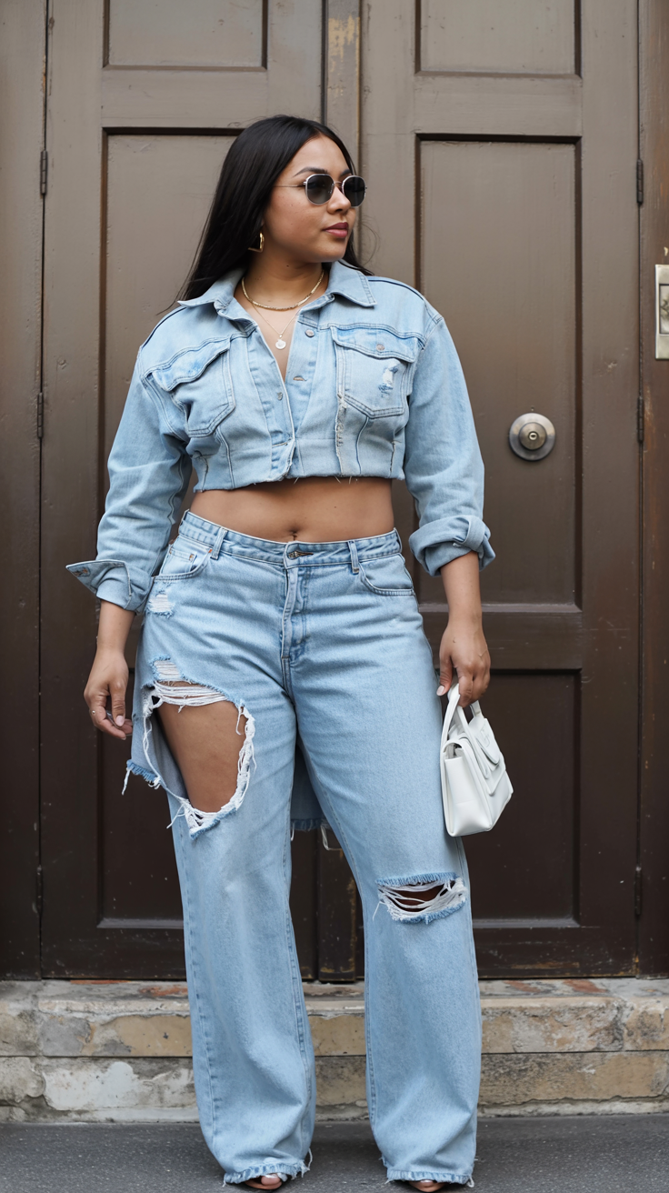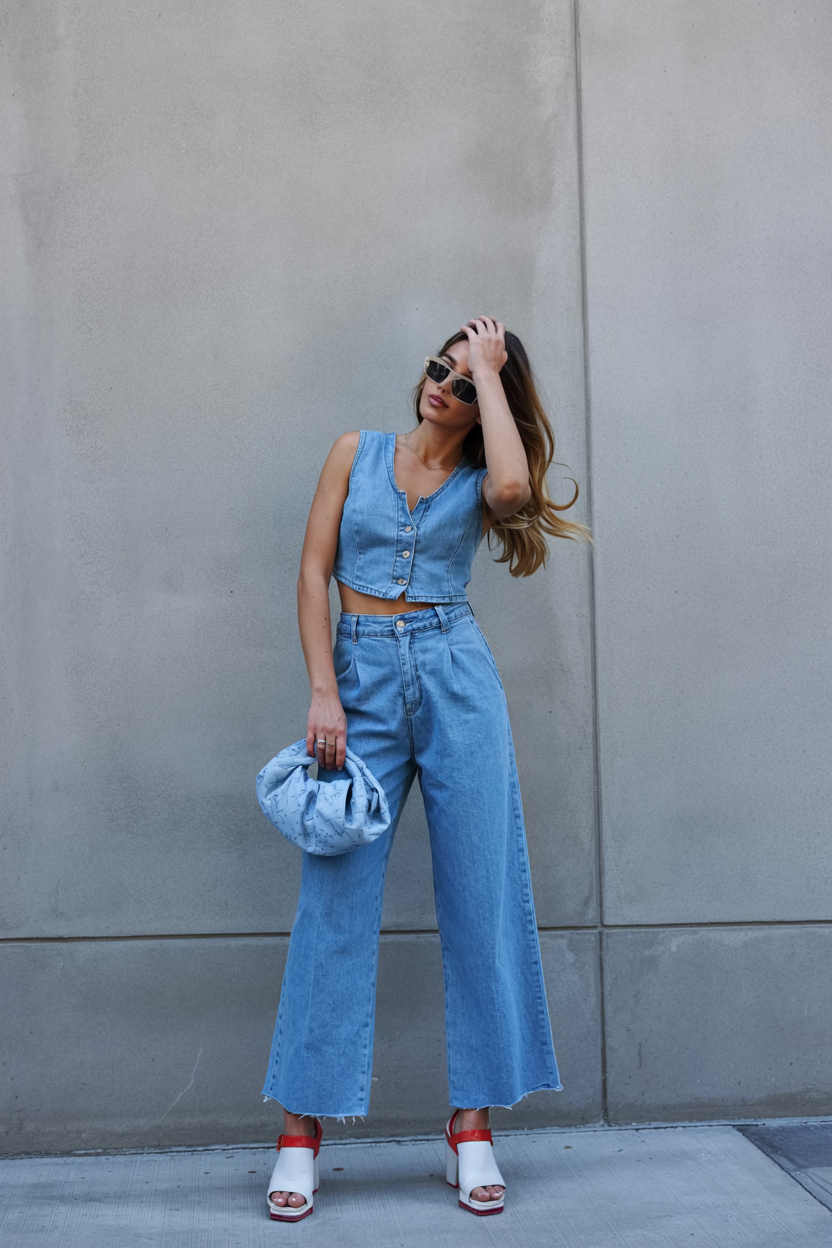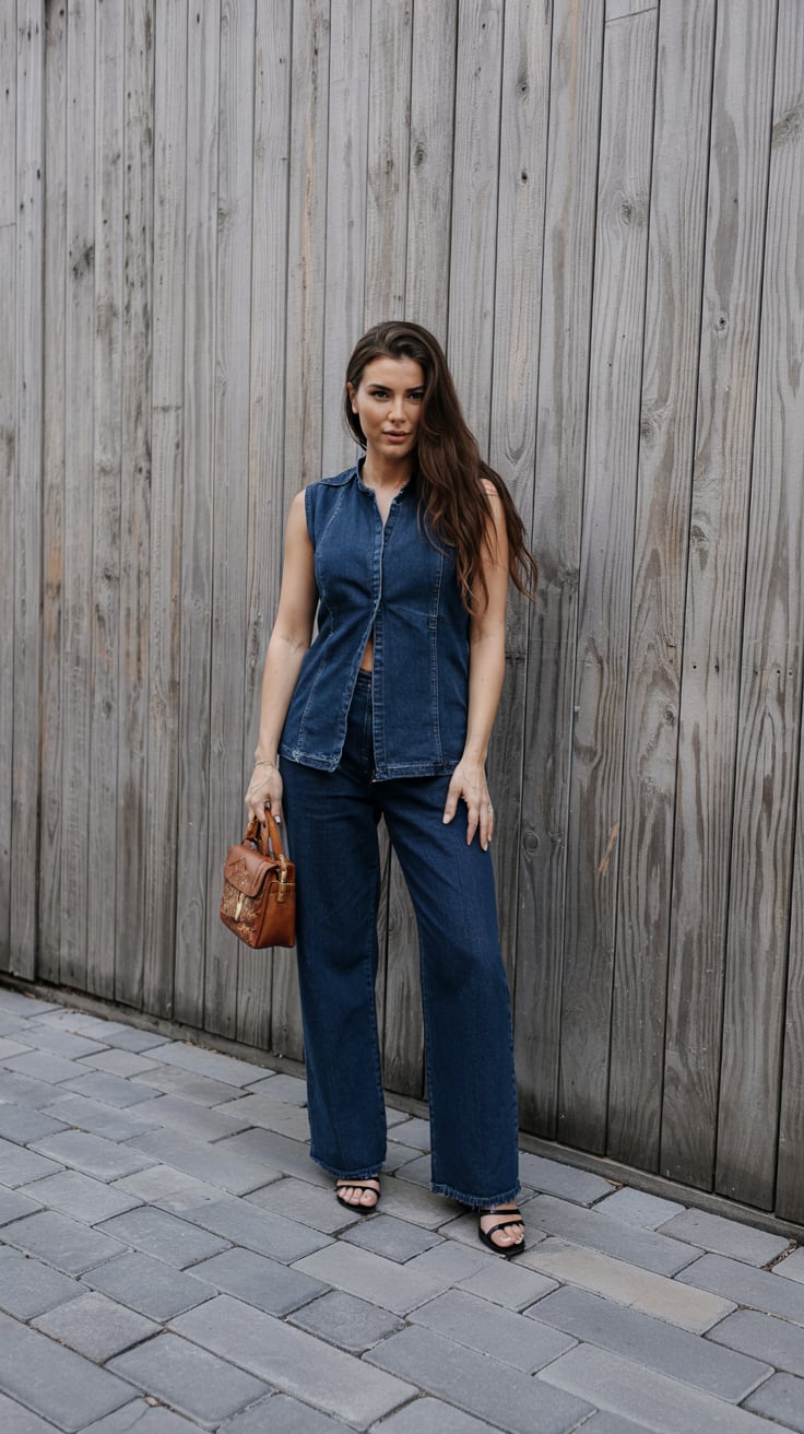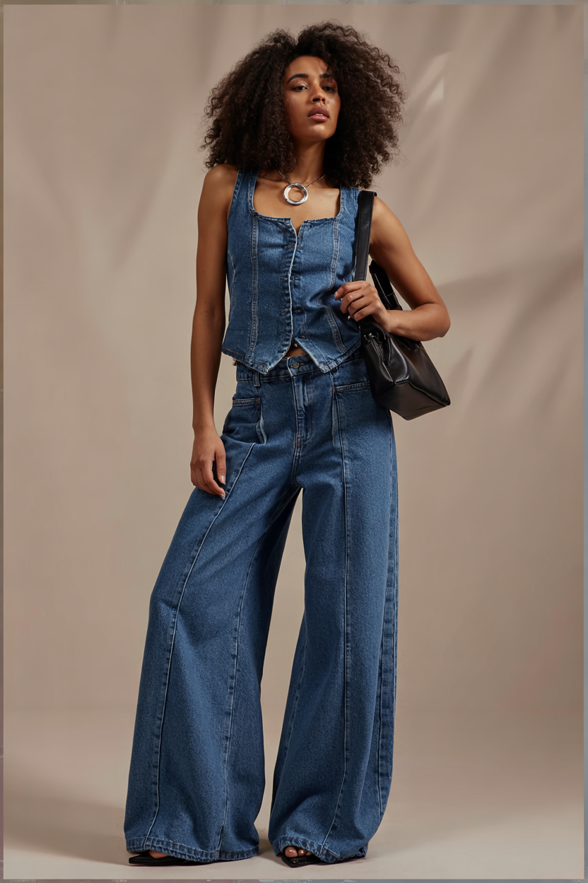 In contrast, the denim vest and high-waisted kick-flare jeans offer much-needed ease and a drastically different attitude. The cropped top emphasizes the waistline without exposing too much skin, and the wider, slightly frayed hem on the denim provides the playfulness and modern twist. With dramatic heels and a soft clutch, you essentially have an outfit in the making, specifically designed for women who like a little excitement added to their double denim ensemble, particularly when headed out at night or over the summer.
