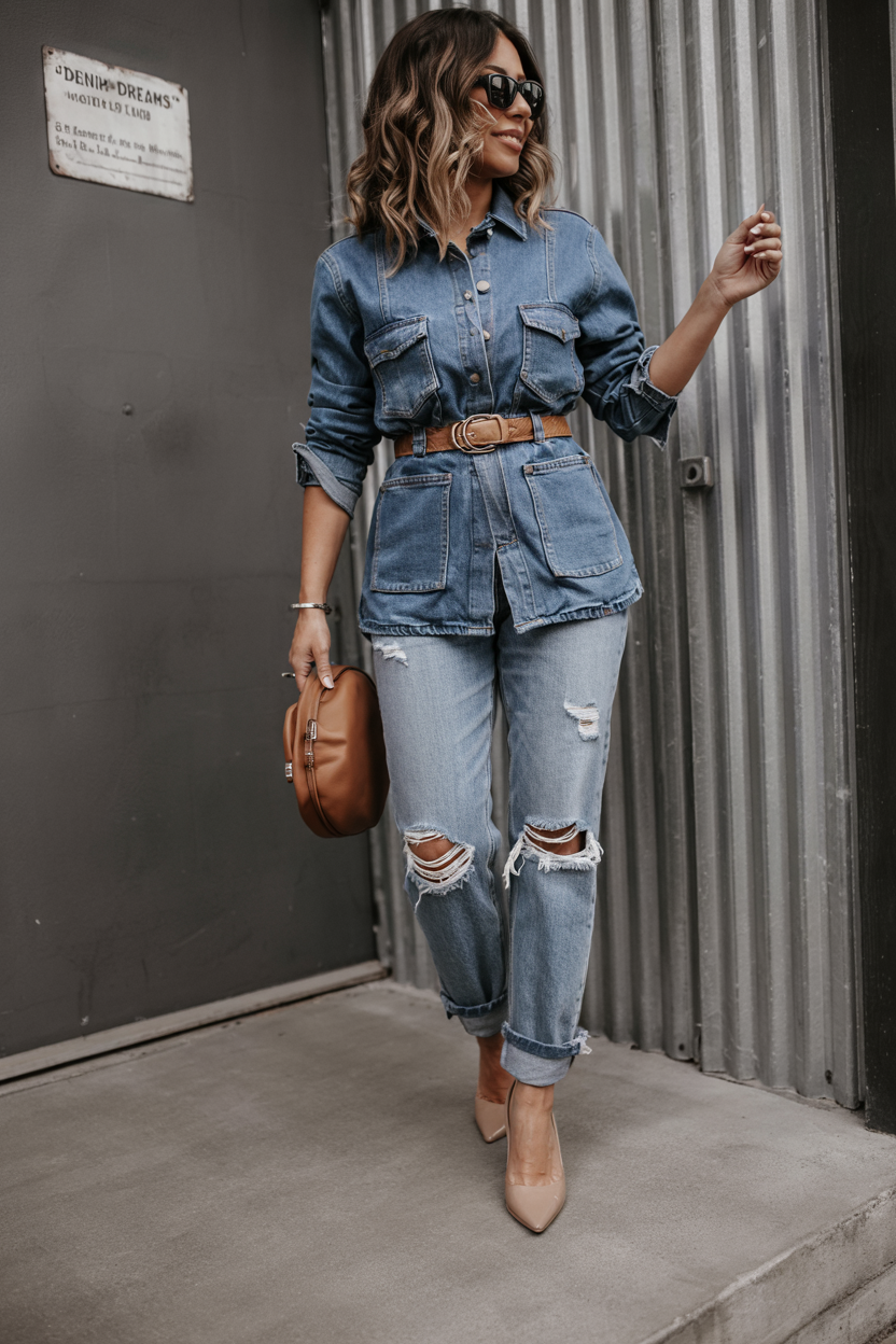 The denim jacket paired with distressed denim and heavily belted at the waist screams cool-girl style, and all the fashionable pieces come together in an incredibly adult way. The belted waist skims and defines, the large pockets add a cool, utilitarian touch, and the slightly ripped knees create a comfortable, playful effect. The nude pumps and refined tote bag make the entire outfit transition seamlessly through the evening and the city. The denim-on-denim outfit in 2026 has the right amount of sass.