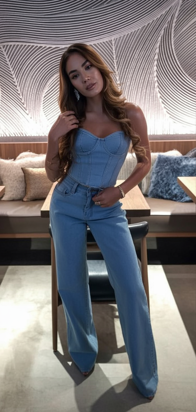 This bustier-style denim top paired with long, drapey jeans is ready for dim lights and good music. The structured bodice shapes the waist and highlights the neckline, while the relaxed pants keep the look from veering into uncomfortable territory. Sparkling earrings and soft waves complete the picture, turning this into a party uniform for women you can rely on for date nights, birthdays, or that big concert you’ve been looking forward to. It’s sensual without being over the top.