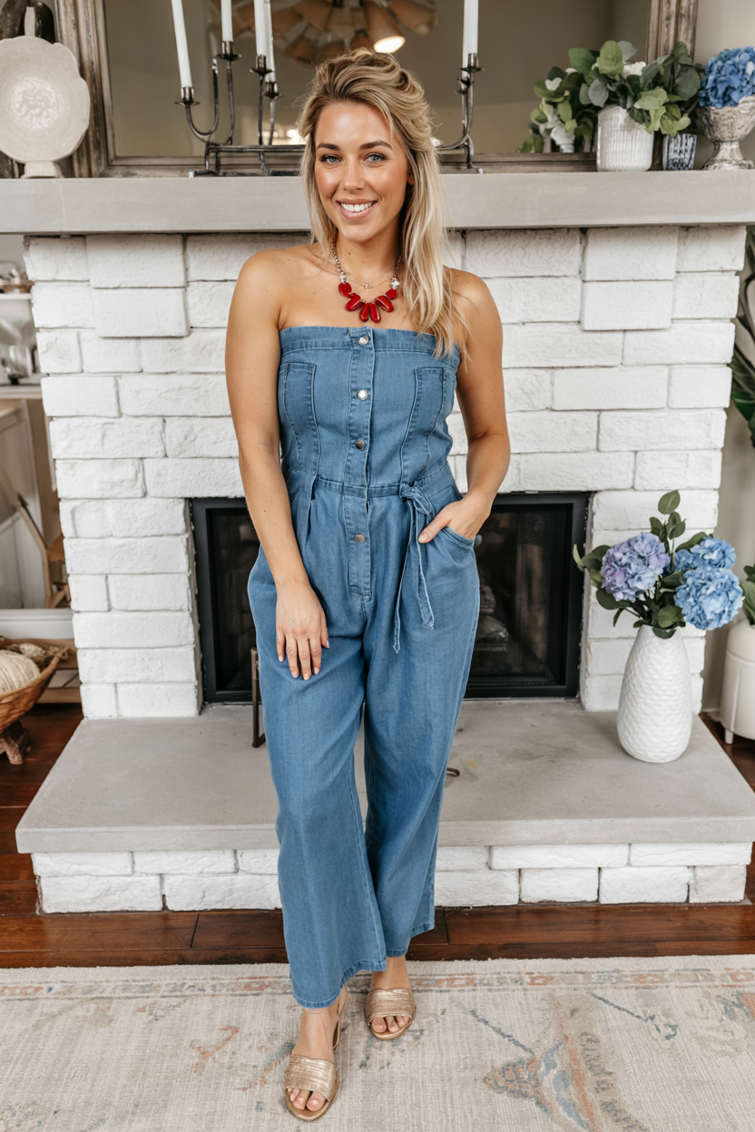 This strapless denim jumpsuit is the fashion equivalent of taking a deep breath and saying, “I’ve got this.” The straight neckline shows just enough skin to feel flirty, while the relaxed legs and soft blue wash keep it grounded and wearable. It’s playful, polished, and a little bit nostalgic in the best 90s way. You can easily imagine wearing it to a backyard gathering, a casual birthday dinner, or a summer festival and feeling perfectly dressed without overthinking it.