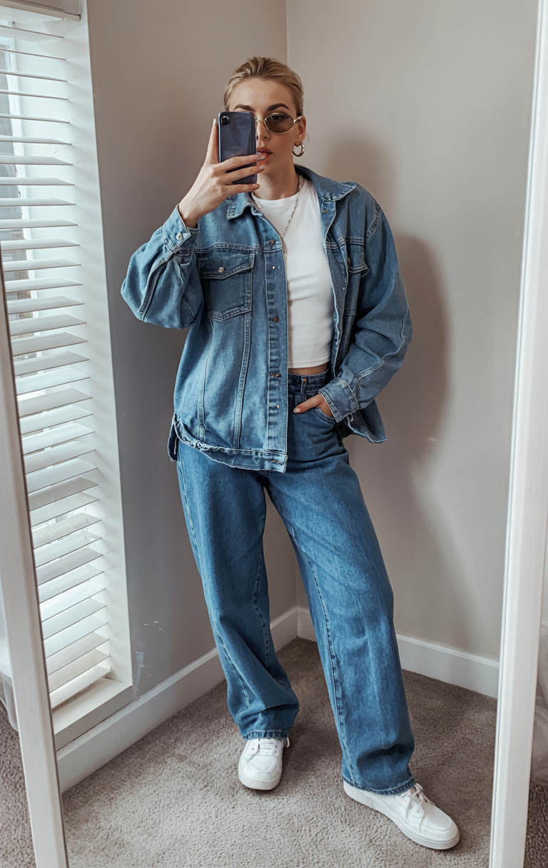 Light denim sets like this make you remember the beauty and ease that double denim has. The light blue and blue together do make such an on-trend and modern hue, especially when you notice the cropped denim shirt and the flowy denim legs. Adding some round sunglasses and a striped bag and keeping those sleeves rolled up and the denim somewhat cropped demonstrates the ability to go out in the evening without even realizing you’re wearing denim on denim, all because you’re wearing the ultimate chill double denim in 2026.
