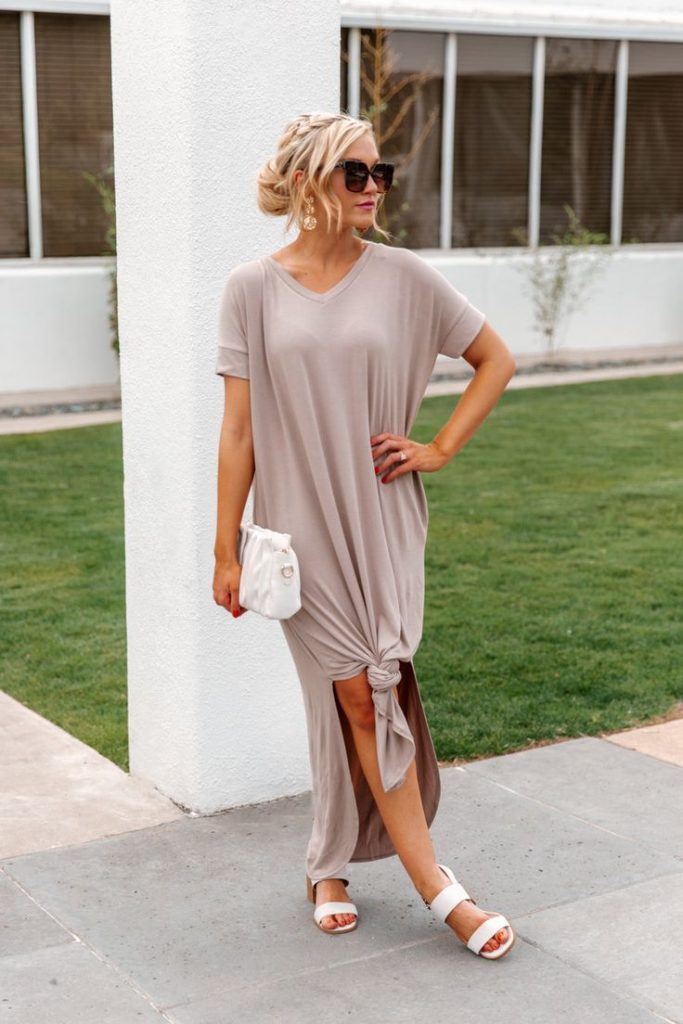 This knotted taupe dress complements any skin tone, while the simple white slides add a modern touch. It’s the perfect dress and sandals outfit casual, suited for a weekend getaway or a relaxed day at the park.