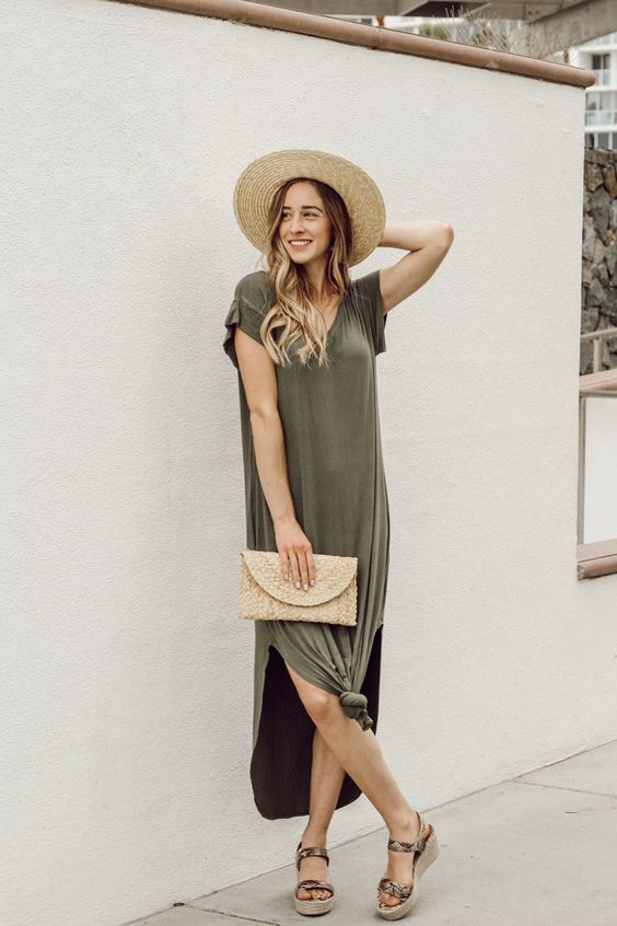 The relaxed silhouette of this olive dress, paired with woven platform sandals and a straw hat, encapsulates a dress and sandals outfit summer look. It’s perfect for those long, leisurely walks along the seaside or browsing through a weekend farmer’s market.