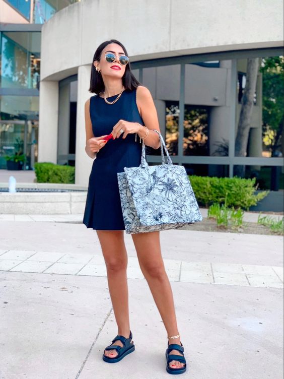 Summer is eternal with a dress and sandals outfit blooming with florals. A tie-front mini dress adorned with colorful blossoms paired with white toe-loop sandals encapsulates the summer outfit vibes. This look is not just a mere trend; it’s a celebration of the bright and playful side of fashion.