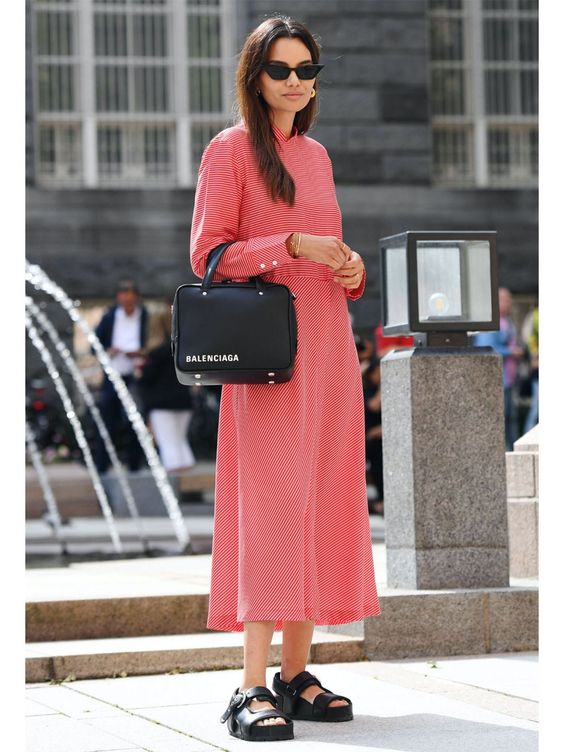 Striped midi dresses with flatform sandals redefine dress and sandals outfit work norms. This pairing strikes the perfect balance between professionalism and personality, making it a staple for the style-conscious worker.