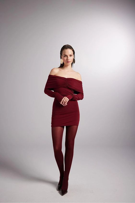 Lastly, an off-shoulder ribbed dress in a deep wine hue paired with matching tights and glossy pumps exemplifies a dress with tights look that works for any season. It is equally fitting for a relaxed spring day as it is for a lively summer night out, proving the year-round versatility of the dress and tights combination.