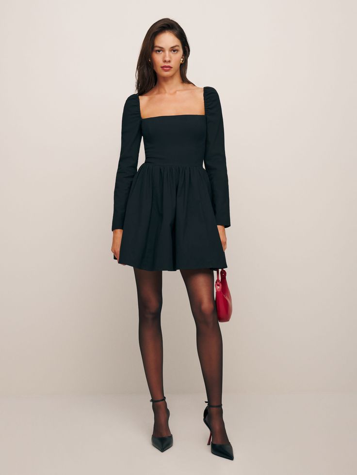 Puff sleeves bring a dash of romance to any dress, and when combined with a square neckline and flared skirt, they create an irresistibly feminine dress with tights outfit. A sleek pair of heels complements the timeless black, making it a versatile pick for both a dress with tights winter look or a formal gathering in any season.
