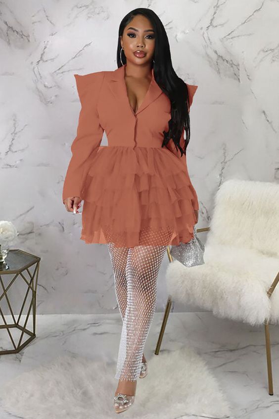 Embrace a splash of color with this coral ruffled mini dress. Its peplum waist and deep neckline create a flirtatious yet formal dress with tights look, especially when paired with crystal-embellished fishnet tights and open-toe heels. This combination is ideal for a dress with tights wedding guest outfit, showcasing both creativity and class.