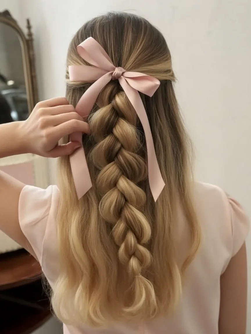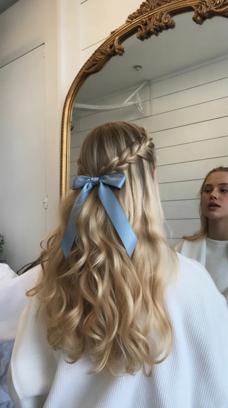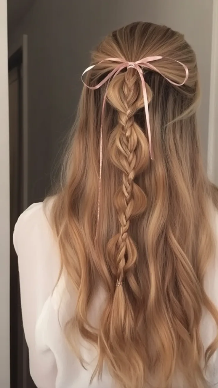 This hairstyle strikes a beautiful balance between relaxed and refined. The braid running down the center, finished with a ribbon, adds just enough detail to make the look feel intentional. It feels soft, feminine, and perfectly suited for spring gatherings.