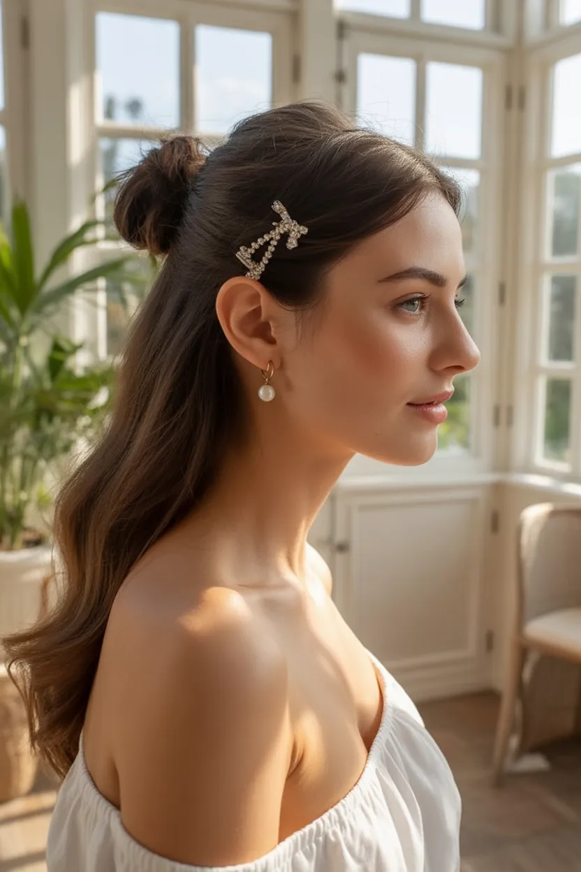 This look works best for women with medium to long hair and is especially flattering if you like half-up, half-down styles that soften the face. It suits fine to medium hair and can easily be adapted with waves or straight ends. A decorative clip does most of the work here, making this an easy option when you want something pretty but not complicated.