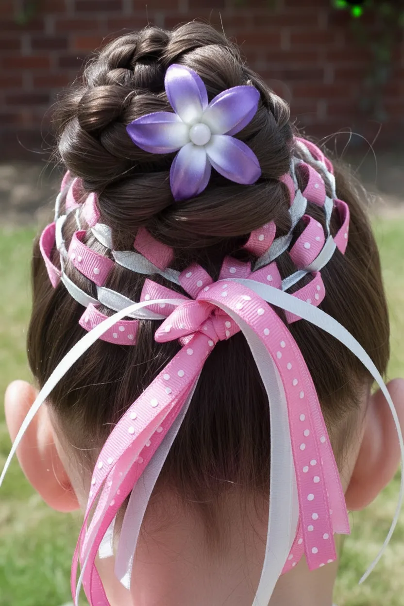 This hairstyle feels whimsical and festive, almost like it was made for Easter celebrations. The braided bun creates a tidy base, while the ribbons add a playful, storybook touch. It has that handmade charm that makes the whole look feel extra special.