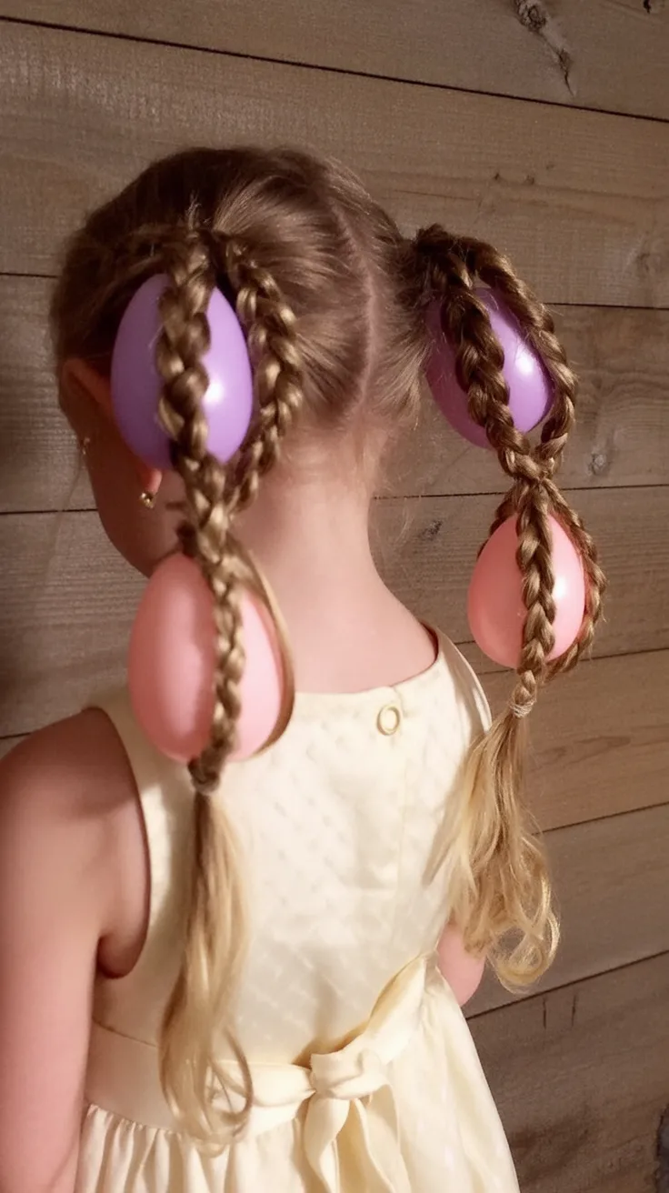 This hairstyle is pure Easter fun. The braids combined with playful egg accents make it feel joyful and creative, perfect for little ones who love themed looks. It’s whimsical without being overwhelming.