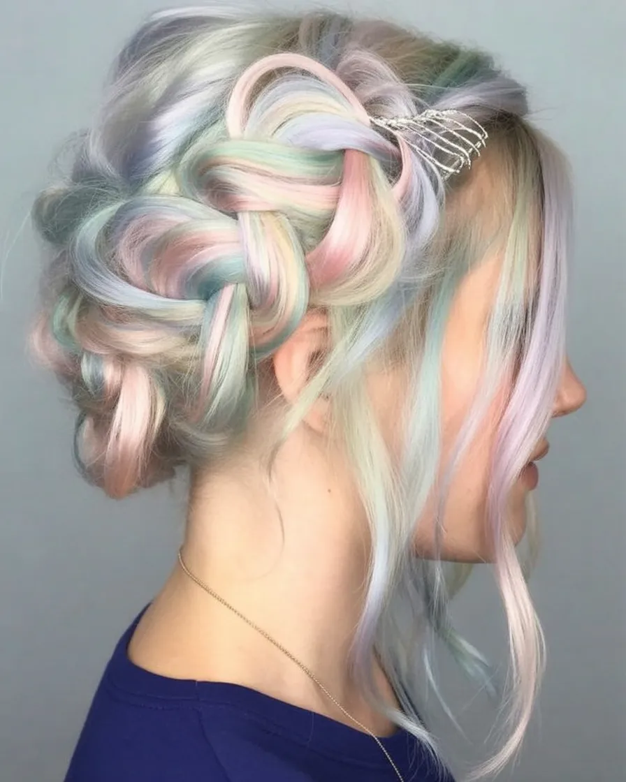 11. Pastel Braided Updo with Soft Face-Framing Strands