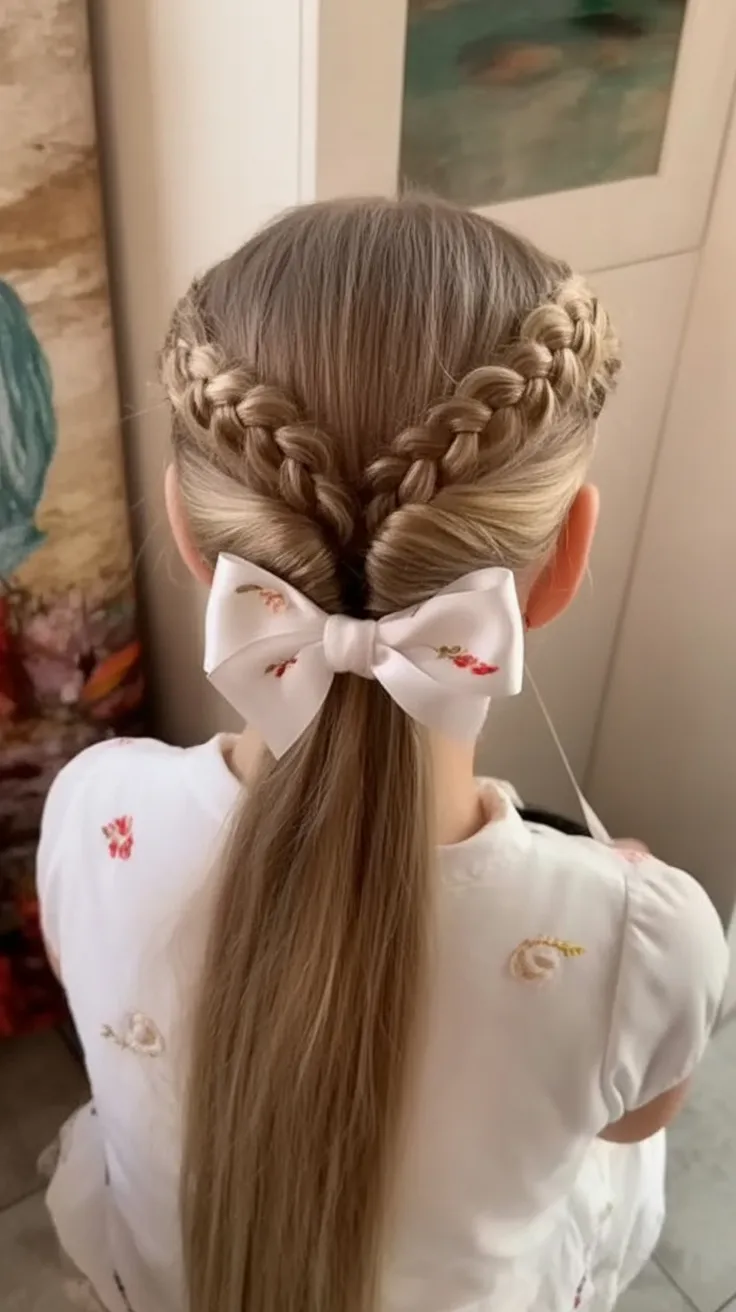 There’s something incredibly sweet and polished about this hairstyle. The twin braids meeting at the back create a balanced, storybook feel that looks timeless and neat. Finished with a white bow, it feels very Easter-appropriate—clean, gentle, and picture-perfect without being fussy.