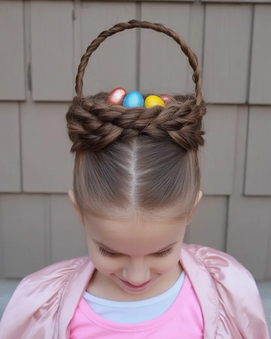 This hairstyle is pure Easter fun, with a braided crown that cleverly mimics the shape of a basket. It feels imaginative and playful, bringing a smile the moment you see it. It’s the kind of hairstyle kids remember and talk about long after the holiday.