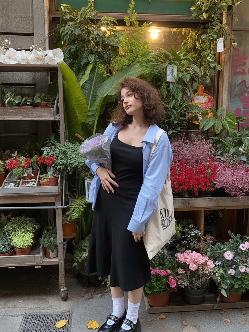 This outfit feels artistic and expressive, like someone who dresses for herself first. The mix of textures and gentle colors creates a thoughtful, almost storybook mood. It’s playful without being loud, and there’s a quiet confidence in choosing something a little unexpected.