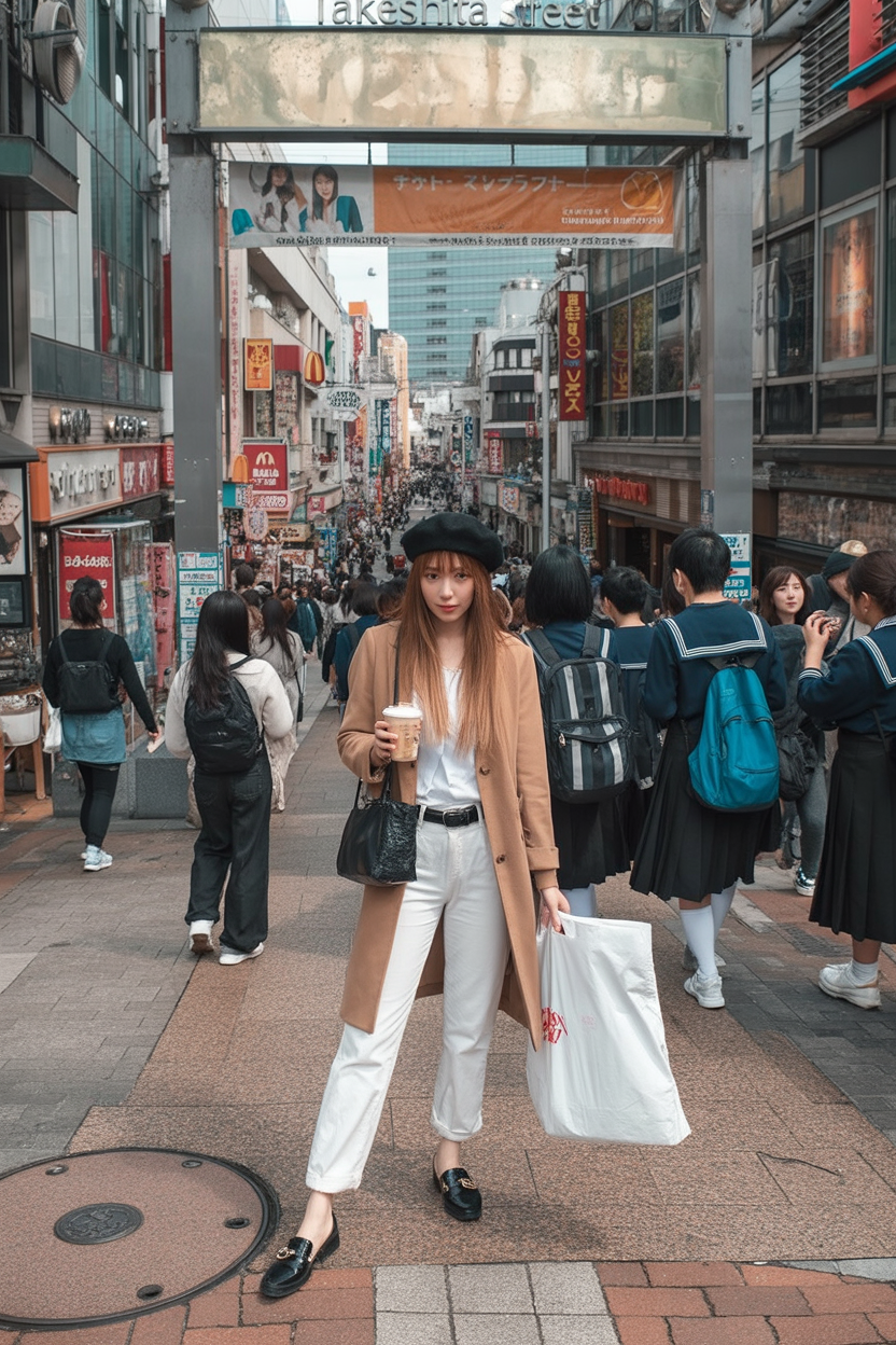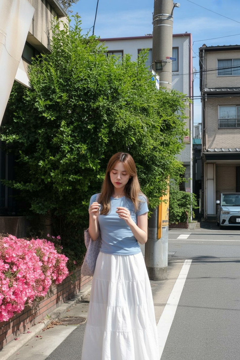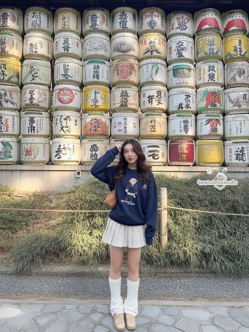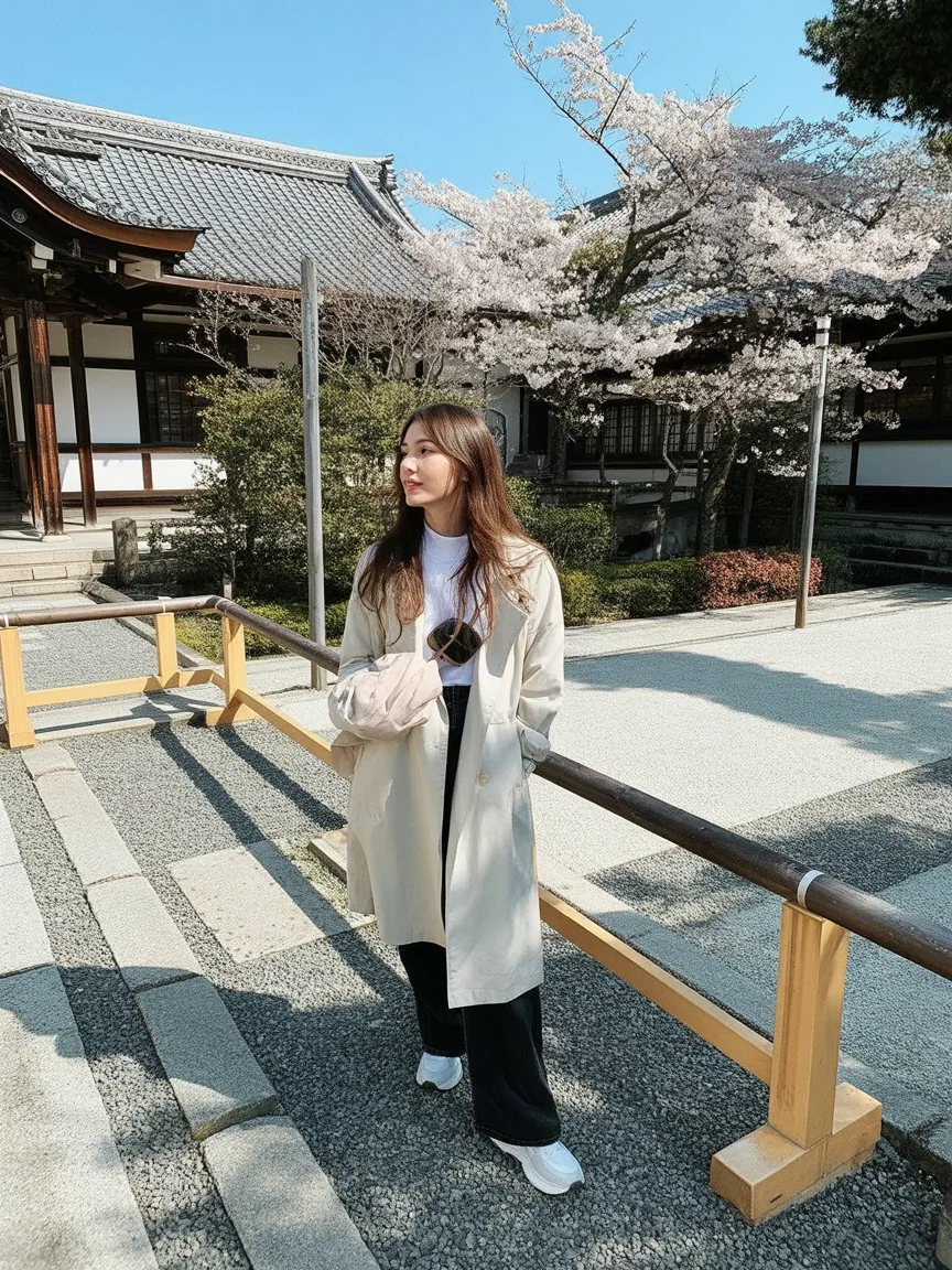This outfit captures that serene moment when tradition meets modern life. There’s a gentle confidence here, the kind you feel strolling through quiet temple grounds while blossoms fall softly around you. The layered neutrals feel intentional but relaxed, creating a mood that’s grounded and observant rather than showy. It’s a look that blends right into the calm rhythm of Japan in spring.