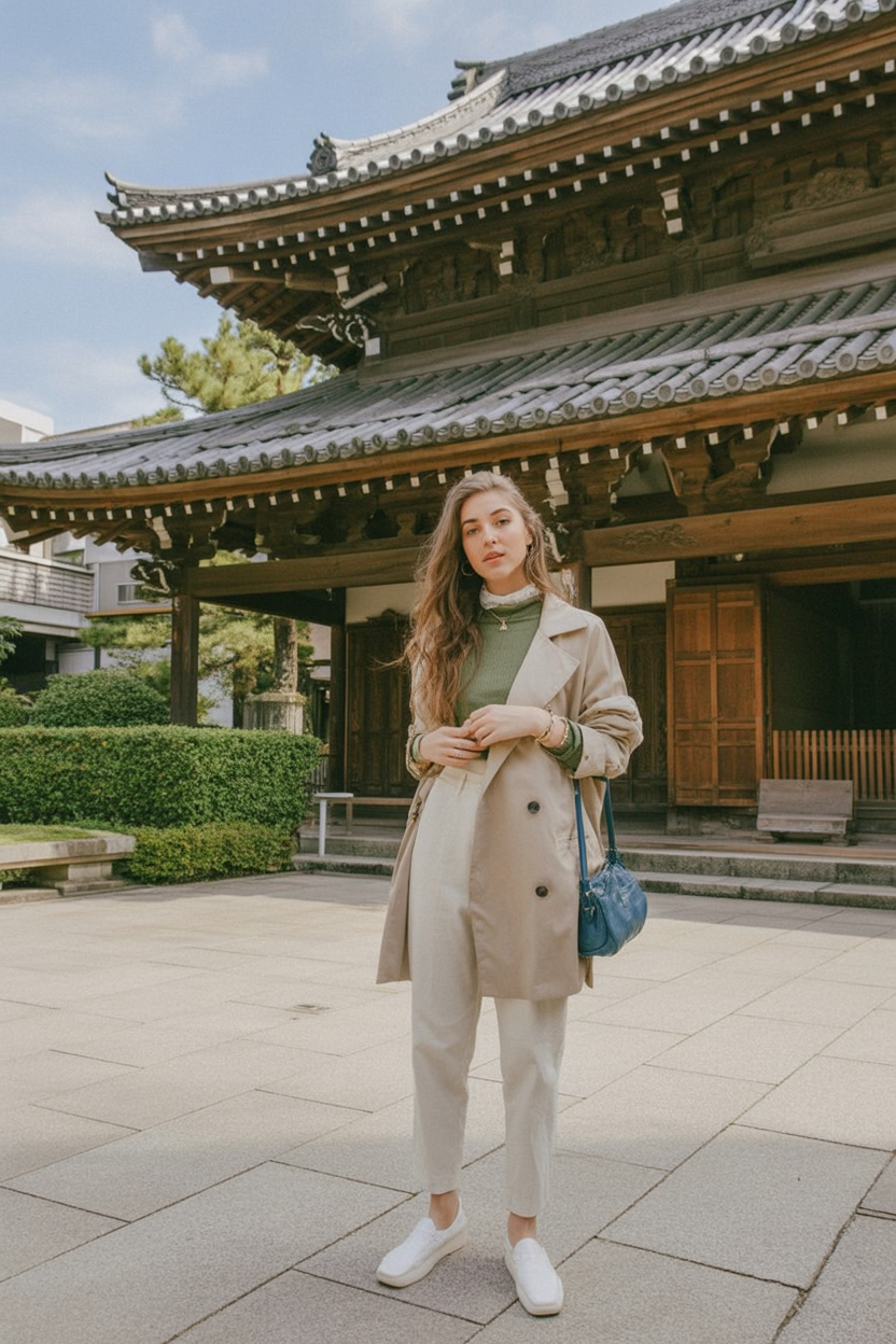 What makes this style special is its versatility. It’s ideal for women who like practical outfits that still feel thoughtful and pulled together. The layers work well for unpredictable spring weather in April and May, and the silhouette moves easily from long walks to casual café stops. It’s especially well-suited for travel days in Kyoto or Tokyo when comfort matters just as much as style.