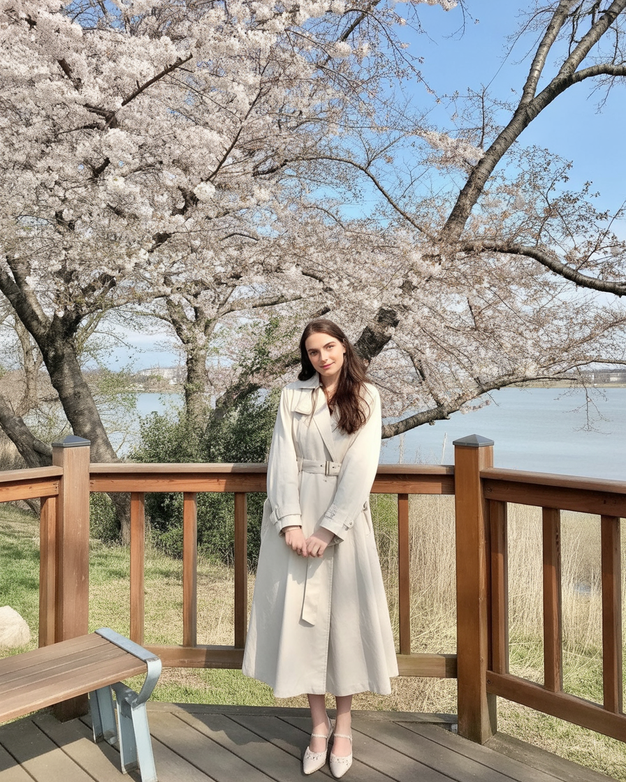 There’s something quietly magical about standing beneath cherry blossoms in early spring, wrapped in soft neutrals that feel both thoughtful and effortless. This look has that calm, romantic mood that makes you slow your steps without trying. It feels reflective, like a peaceful morning walk when the air is still cool and the world hasn’t quite woken up yet. The long coat drapes gently, giving the outfit a graceful flow that feels very Kyoto in spirit.