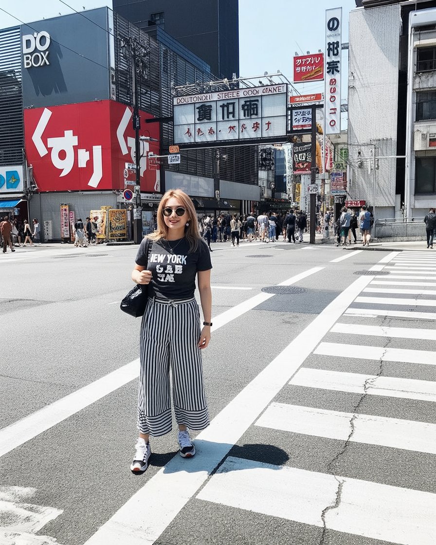 This style works especially well for women who love statement pieces without overthinking. Striped pants elongate the silhouette and pair beautifully with simple tops. It’s a great example of modern street style in Osaka, offering inspiration for women who want comfort, personality, and confidence all in one look.