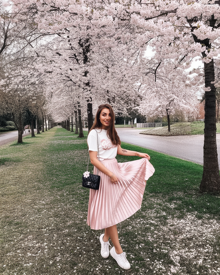 If you’ve been looking for motivation to embrace softer styles, this is your sign. Floral skirts and crisp tops flatter a wide range of women and bring a sense of renewal that feels perfect for 2026. It’s a beautiful choice for spring outings, photos, or simply enjoying the fleeting beauty of cherry blossoms in full bloom.