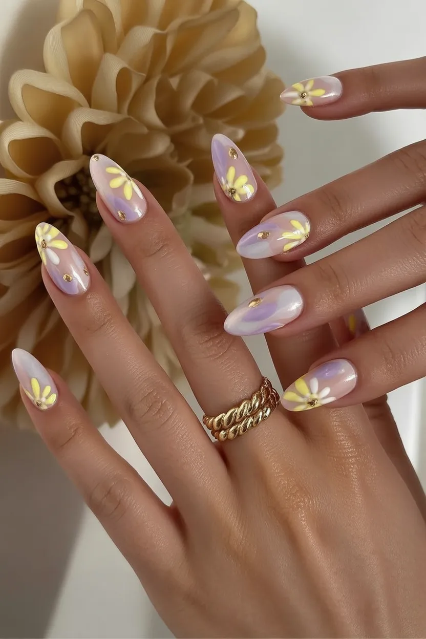 This manicure feels soft, feminine, and quietly cheerful. The pastel base paired with delicate yellow flowers creates a gentle springtime mood that feels fresh without being loud. The chrome finish adds a modern glow, while the floral art brings warmth and charm, like pressed flowers tucked into a favorite book.