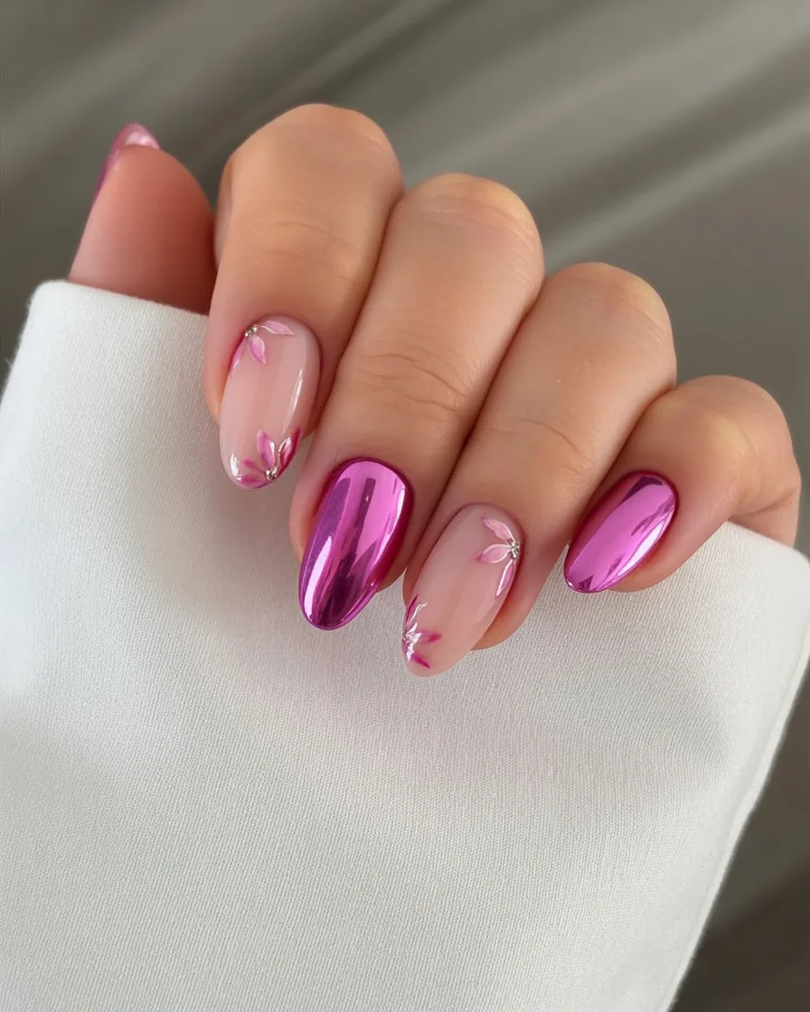 This manicure blends soft pink tones with bold chrome accents in a way that feels playful and confident. The mix of finishes keeps things interesting, while delicate floral details add a romantic touch. It’s fun, expressive, and perfect if you like your nails to feel like an extension of your personality.