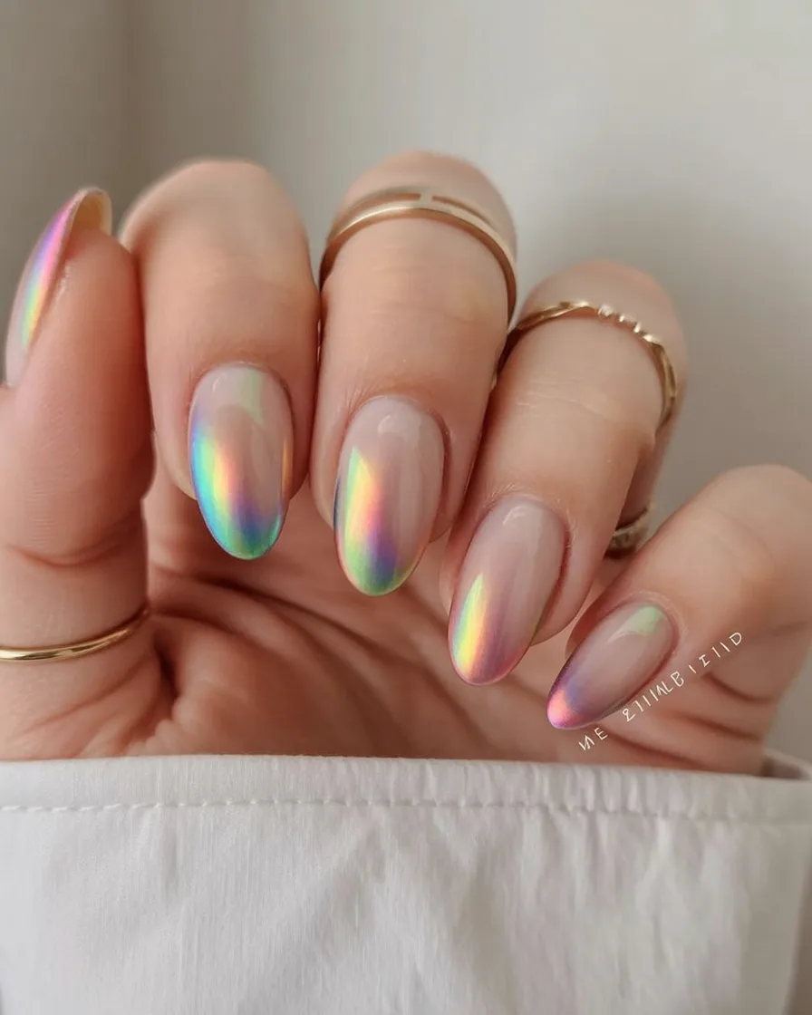 At first glance, this manicure feels soft and neutral—but then the rainbow chrome catches the light, and everything changes. It’s subtle, modern, and quietly mesmerizing, offering just enough color play to keep things interesting without overwhelming the look.
