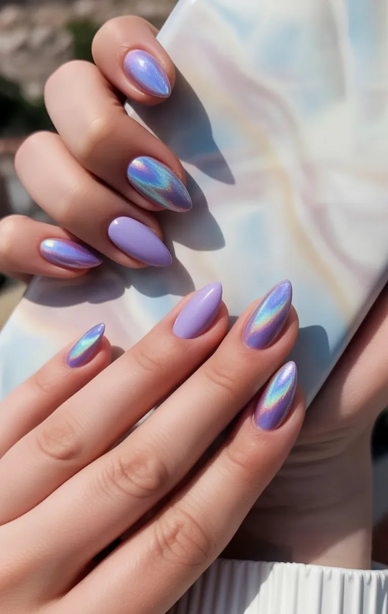 This manicure feels playful and luminous, almost like sunlight dancing across water. The purple chrome has a soft rainbow shift that feels magical without being over-the-top. Paired with an almond short shape, it stays practical while still delivering that wow factor we all secretly love.