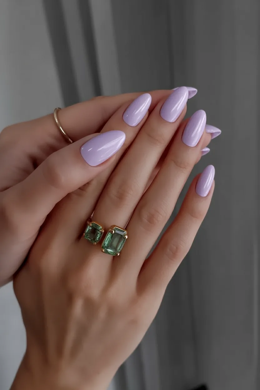 There’s an effortless calm to this lavender chrome manicure that feels very now. The smooth, reflective finish paired with a classic almond shape gives off that polished-but-relaxed energy we all crave in spring. It’s minimal, modern, and quietly stylish—perfect if you love looking put-together without leaning into heavy designs or bold contrasts.