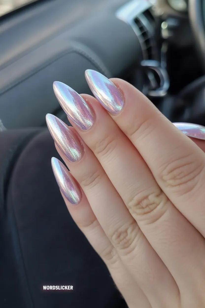 This style is perfect if you want emotional payoff without committing to bright shades. It feels calming, elegant, and fresh, making it ideal for spring chrome nails 2026 that blend versatility with beauty. Almond nails enhance the softness, while the chrome adds that little spark of joy.