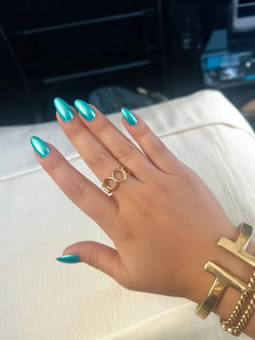 This look is ideal if you’re craving a statement without heavy designs. The almond shape softens the bright tone, making it surprisingly wearable. Turquoise is a fun alternative to classic blue or green, and the chrome finish keeps it firmly rooted in 2026 ideas. Perfect if you want Inspo that feels bold but polished.
