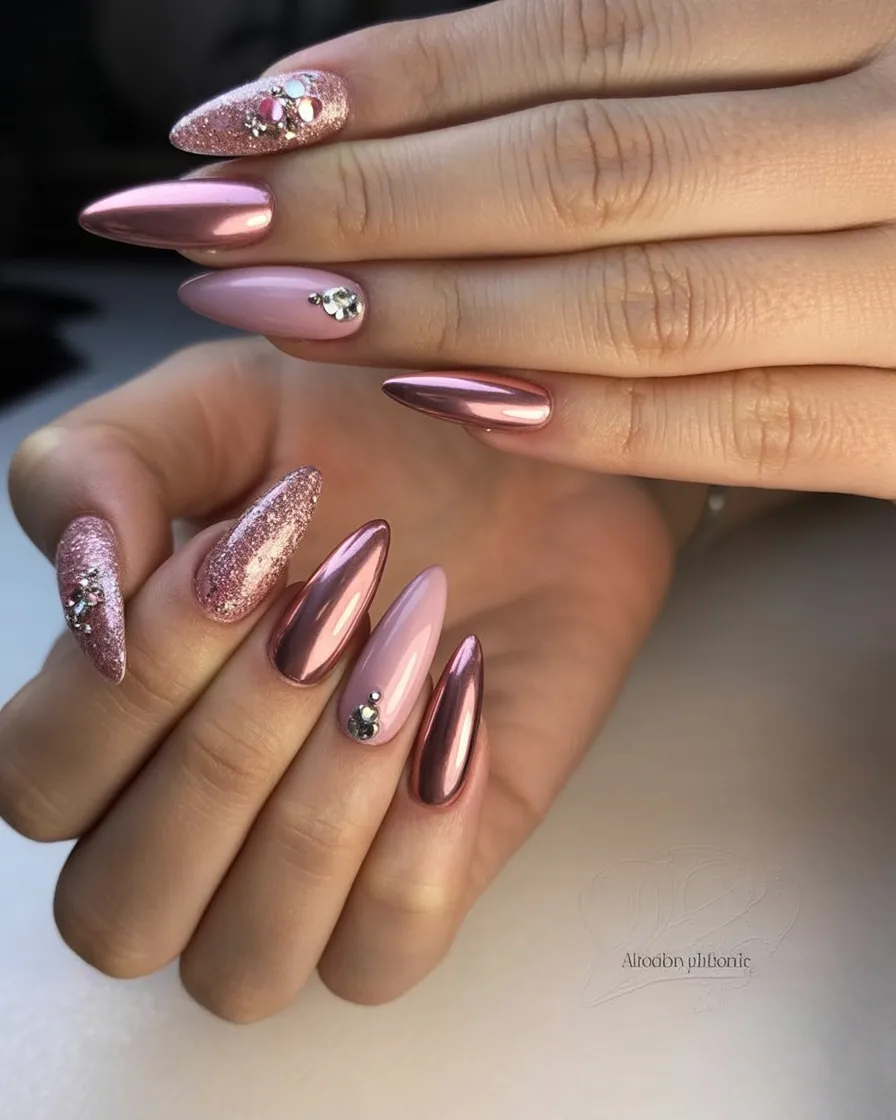 This is a great motivational choice if you’re craving a refresh that feels safe but still exciting. Pink works for every season, and the chrome finish updates it perfectly for 2026. Almond nails keep the silhouette elegant, making this an easy go-to for both everyday and special moments.