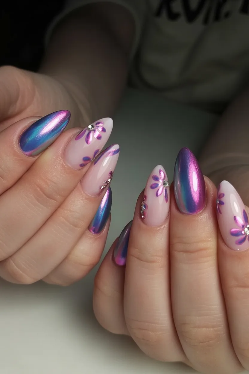 What makes this design special is the balance between detail and restraint. The flowers are subtle, not overwhelming, and the almond shape keeps everything elegant. It’s perfect if you love flower designs but still want something wearable for daily life. A lovely choice for spring chrome nails 2026 that feels romantic yet current.