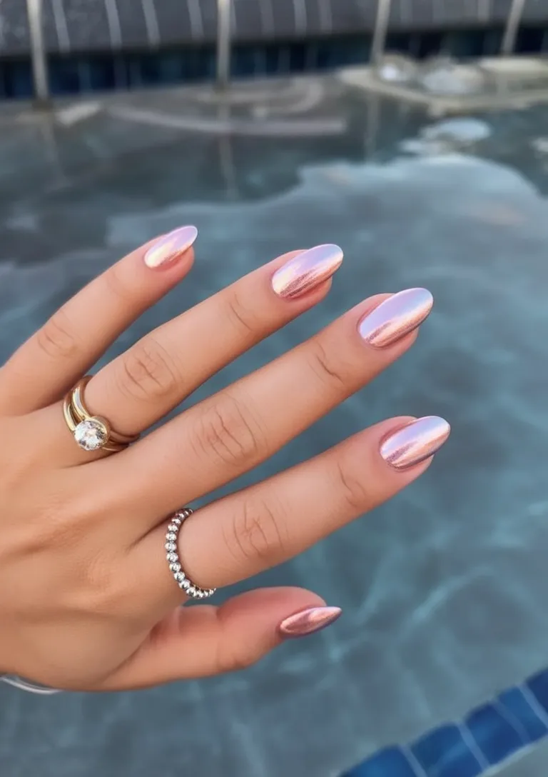 There’s a quiet luxury to this soft pink and pearl chrome combination that feels incredibly refined. The gentle contrast between blush pink and luminous chrome creates a calm, pretty effect that never feels overdone. It’s the kind of manicure that makes your hands look instantly polished, almost like a beauty filter in real life.